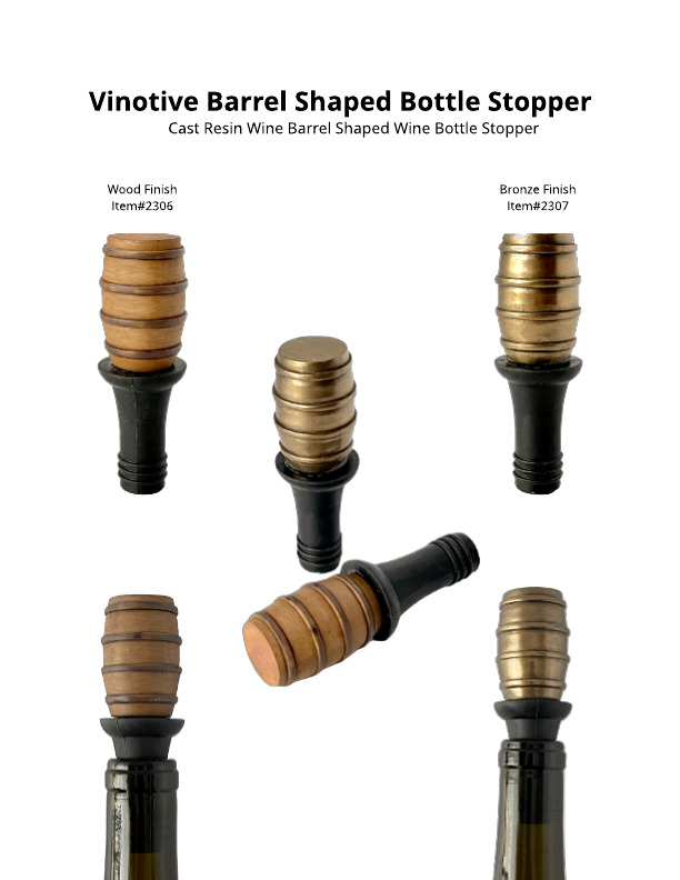 Description: Available in Wood and Bronze finishes, these barrel stoppers say WINE, without having to engrave, stamp or print anything on it! With a silicon stopper to create an airtight seal, we can bulk pack or custom pack them for your needs.